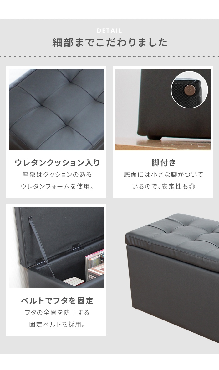 | 座ると収納がひとつになったスツールボックス。 座面の下は収納スペースになっているので、散らかる小物類や本、CD・DVDなどの収納に最適。 合成皮革を採用。撥水性があり、汚れてもサッと拭けるので、お手入れもラクラク。 スツールの底面には小さな足が付いているので、安定性も◎ 色違いを交互に並べてみたり、同シリーズのスツールタイプと合わせてみたり、自分好みのアレンジでお部屋のアクセントになるインテリアとしても大活躍。 |
