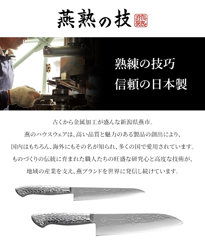 | 〜匠の凄技〜 食材を美味しく、そして美しく調理するために至高の切れ味、究極の長切れを追求した高級ステンレス包丁。 [刀身] 食材の繊維を壊さず、うま味を逃がさない極上の切れ味。 刃物の命ともいえる刃研ぎは、サムライの時代から脈々と受け継がれてきた伝統技法による手仕事。 職人が長年の経験をもとに時間をかけてじっくり研ぎ上げ、鮮烈な切れ味を生み出しています。 [槌目] 魅力的なデザインと機能性。 細かく綺麗に打ち込まれた槌目は、ひとつとして同じ模様が存在しません。 食材の身離れをよくする切れ味との相乗効果もあります。 [ハンドル] 気品ある槌目模様、深みある銀の色調。 変則的な打痕が美しい陰影を生み出す印象的なデザインです。槌目の上に滑りにくい加工を施し、手に吸い付くような感覚と握りやすさを実現。 さらに中を空洞にしたモナカ柄にすることで軽さも両立しました。 長時間使っても疲れにくい構造です。 |
