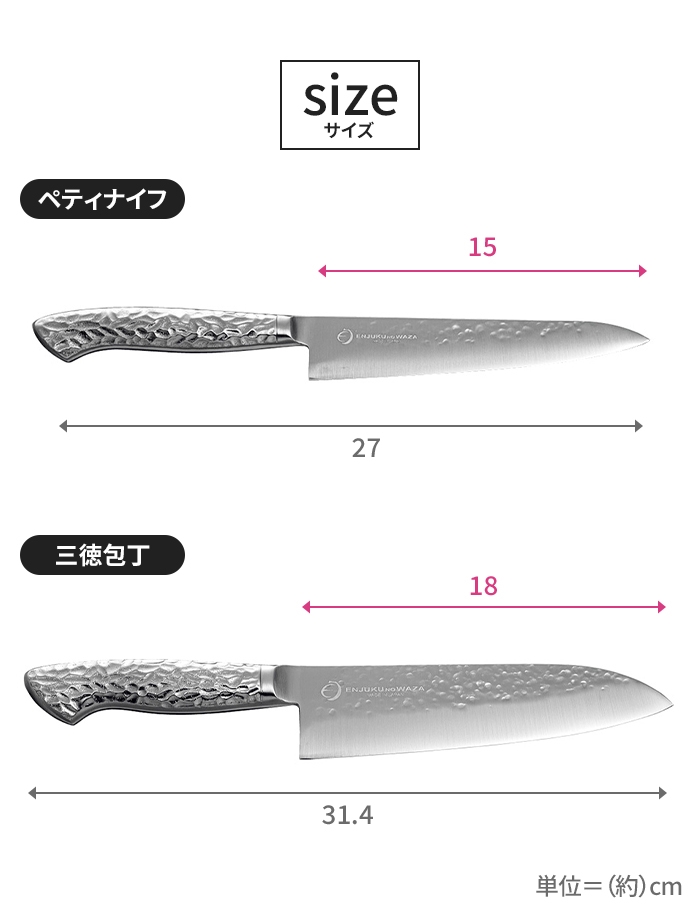 | [ペティナイフ]約全長27cm (刃渡り15cm) [三徳包丁]約全長31.4cm (刃渡り18cm) |