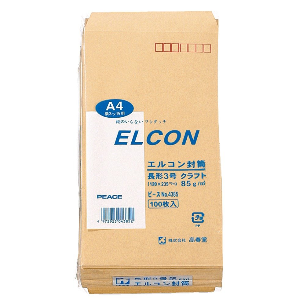 高春堂 ピース封筒 4385 長3エルコン 100枚パック クラフト85g/m2 グリーン購入法適合 R40再生紙使用