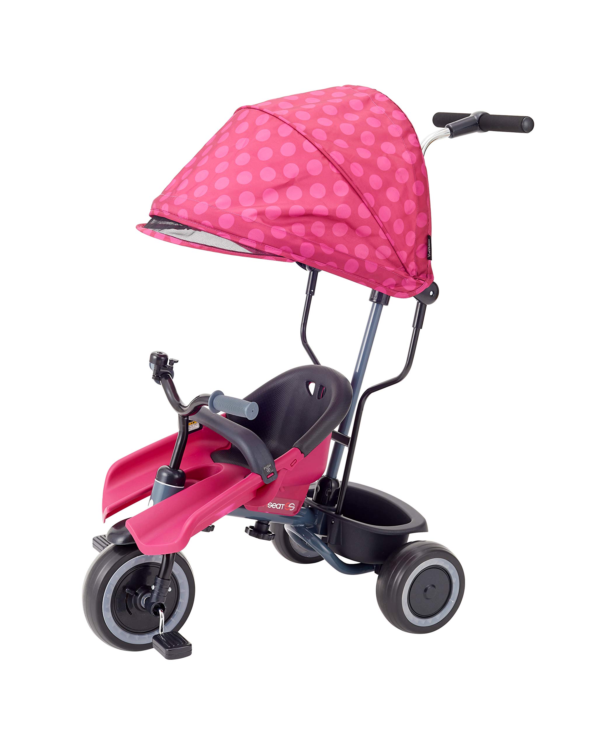 【やさしさポイント】<br>●1歳半頃〜<br>すべて取り付けてベビーカー代わりに<br><br>●2歳頃〜<br>ペダルに足が届くようになればフットサポートを取り外してください。<br><br>●3歳頃〜<br>自分でこげるようになったら押手とサンシェードも取り外してあげてください。