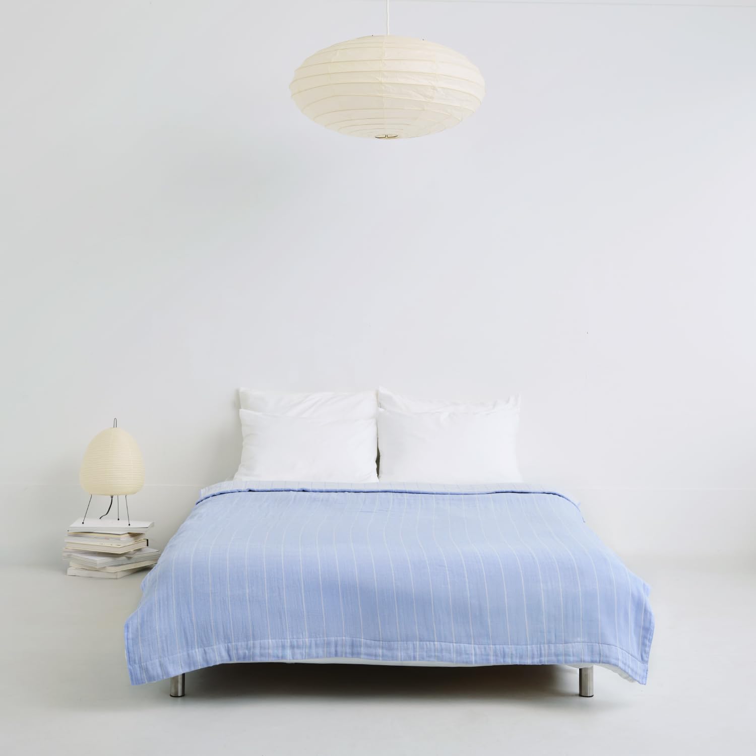 ストライプのリバーシブル仕様で、その日の気分やお部屋の雰囲気に合わせて使い分けられるデザイン。透けるように涼やかで、飴細工にインスピレーションを受けたブルーのストライプ。朝の目覚めもすっきりと爽やかに感じられるような印象をもたらします。シンプルだけど、どこかやさしくお部屋が明るく。hauuらしい、柔らかな色合いが楽しめます。