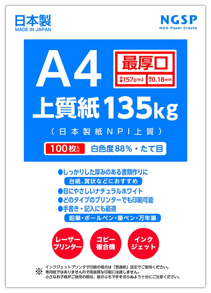 商品名:【最厚口】A4 上質紙 135kg 国産(日本製紙NPI上質) (A4 100枚)
