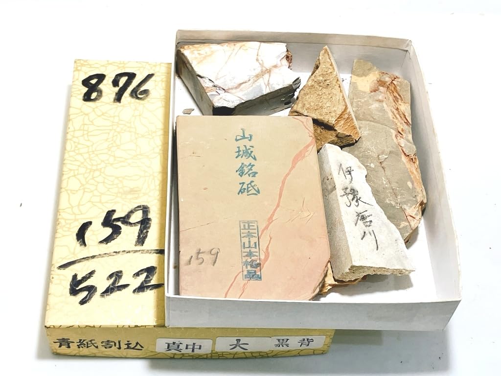 色:中世山城銘砥 山本流鍛え済原石 函外寸(概寸)肥後守十丁箱入約g # 天然砥石
