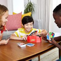 ウノに早押し対決のルールを追加。+1~+3のショーダウンアイコンがあるカードが出たら、該当枚数をマシンにセットして、次のプレイヤーと早押し対決。タイマーのライトが緑に変わった瞬間に、早くスイッチを押した人が勝ち。早押しに負けた人は、出てきたカードを手持ちのカードにしなくてはなりません。