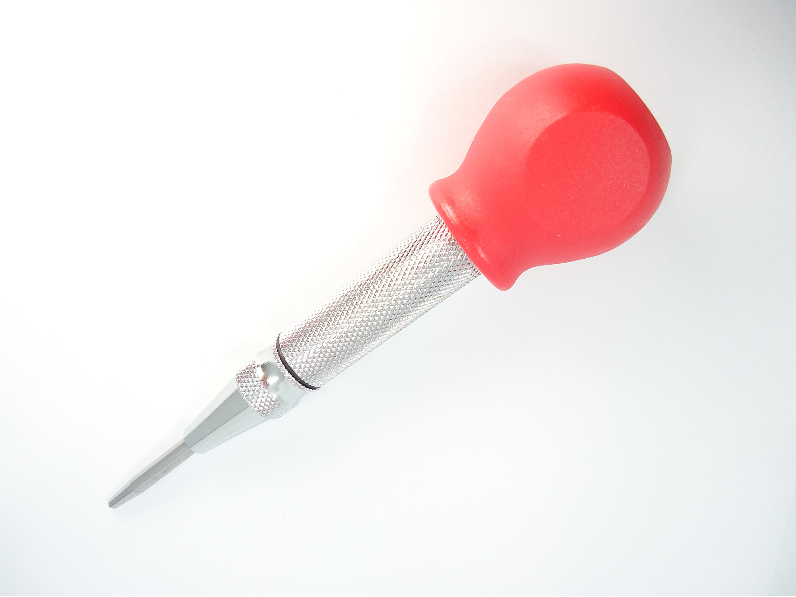 ドリルで穴を開けるとき、ドリルが逃げないように窪みを作るためのポンチです。頭部を押し込むだけで、自動で打刻することができるオートマチックポンチとなります。