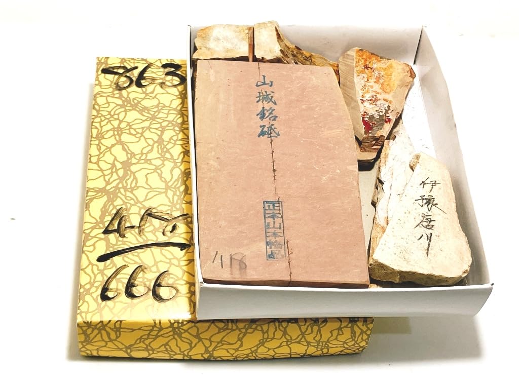 色:中世山城銘砥 山本流鍛え済原石 函外寸(概寸)肥後守十丁箱入約g # 天然砥石