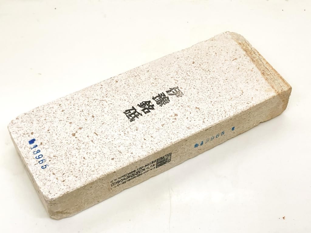 採鉱は重機、裁断はダイヤモンド墓石切で”伊豫銘砥”号の砥石については模倣無断銘振り製品ですから弊社関与しません。2007年頃からの”伊豫銘砥”号は弊社のみ。この分別の為に小こっぱ以外の銘は手書き。弊社選鉱、製造外の後載り”伊豫銘砥”の問い合わせについてはお答えできかねます。