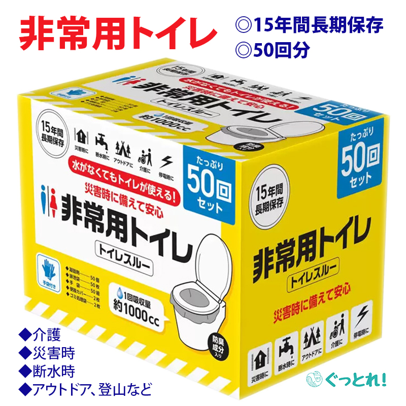 非常用トイレ 災害時 水なしで使える 50回セット 15年長期間保存 防臭成分入り 手袋付き 1回約1000CC吸収 断水 アウトドア 介護 停電 トイレスルー コストコ