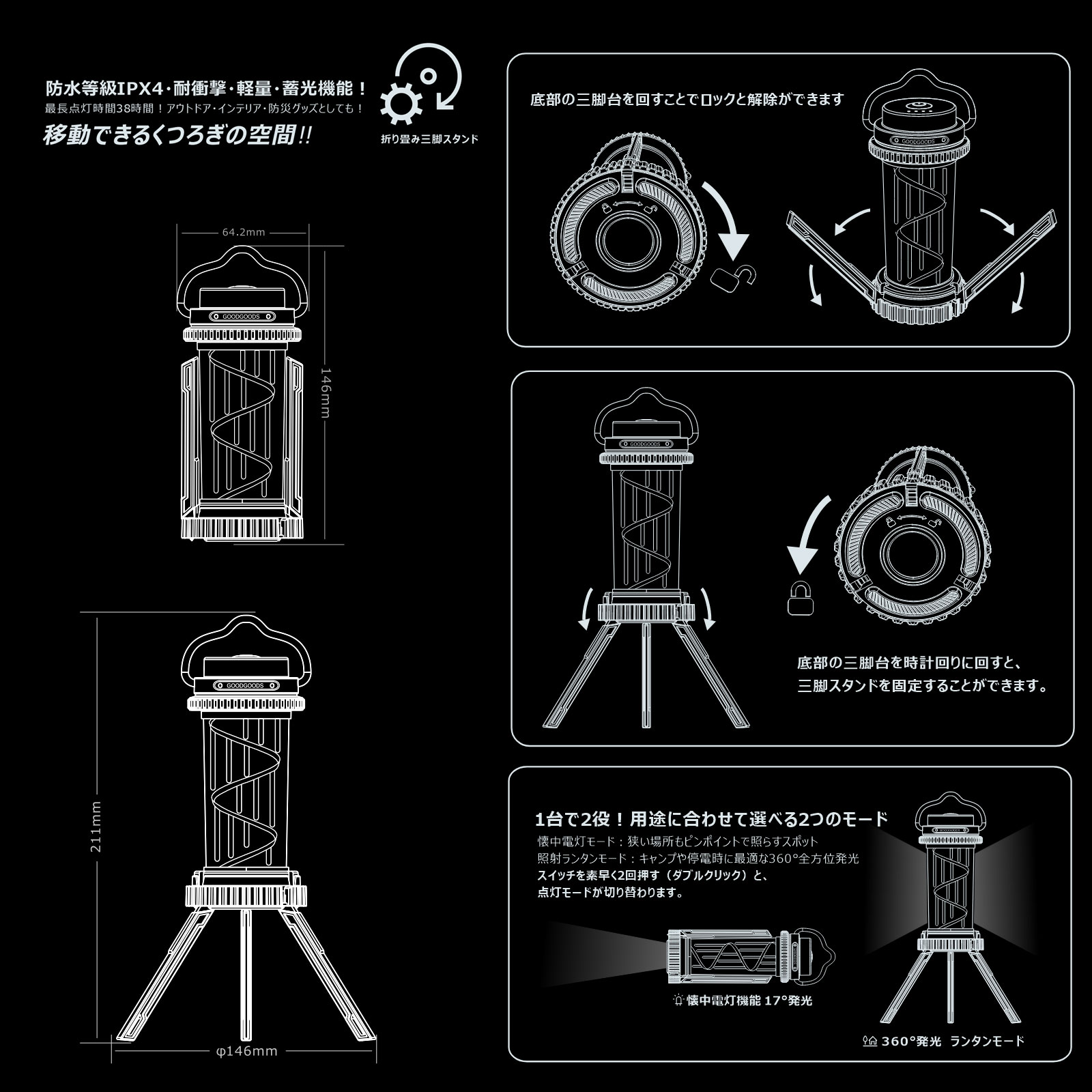 | 商 品 名 | LEDランタン 三脚スタンド 懐中電灯 | ||