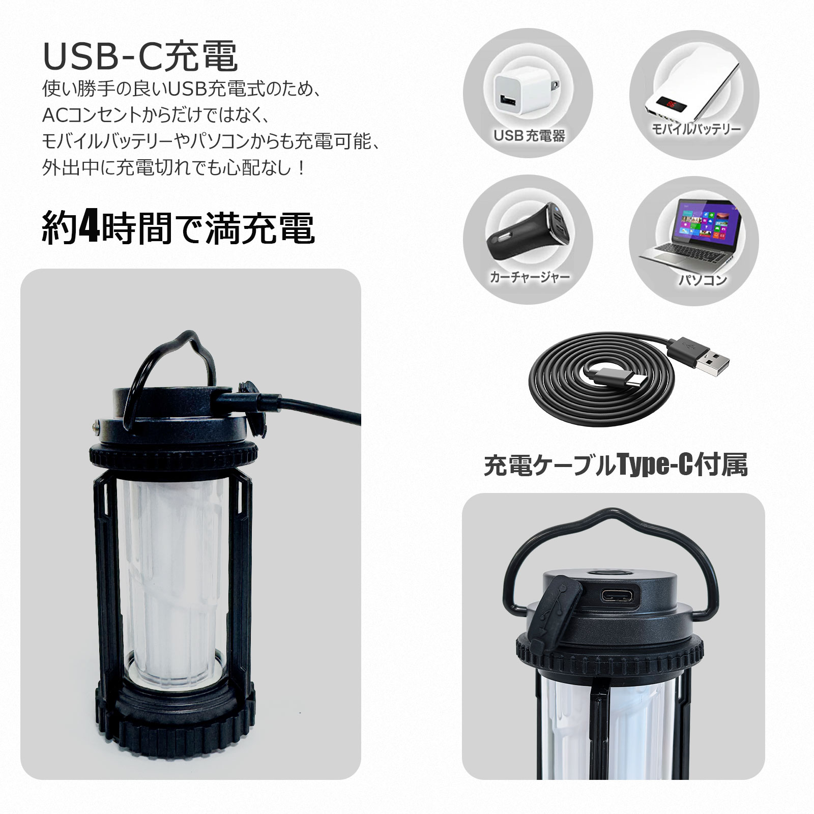 | ★オススメポイント★ ライト単体なら懐中電灯として利用も可能! 充電指示ランプ付き!便利にご使用頂けます。 最長点灯時間38時間! アウトドア・インテリア・防災グッズとしても! 点灯4モードでお好きな発光色で点灯可能!さらに長押しで無段階調光も可能! 広い用途 キャンプランタンとしてテント内の照明はもちろん、夜釣り、バーベキュー、車中泊、登山、防犯/防災、停電などの非常時、作業などの必需品としてお勧め! コンパクトなので持ち運びやすく、用途に合わせて懐中電灯・ランタンを使い分けできる優れもの! |