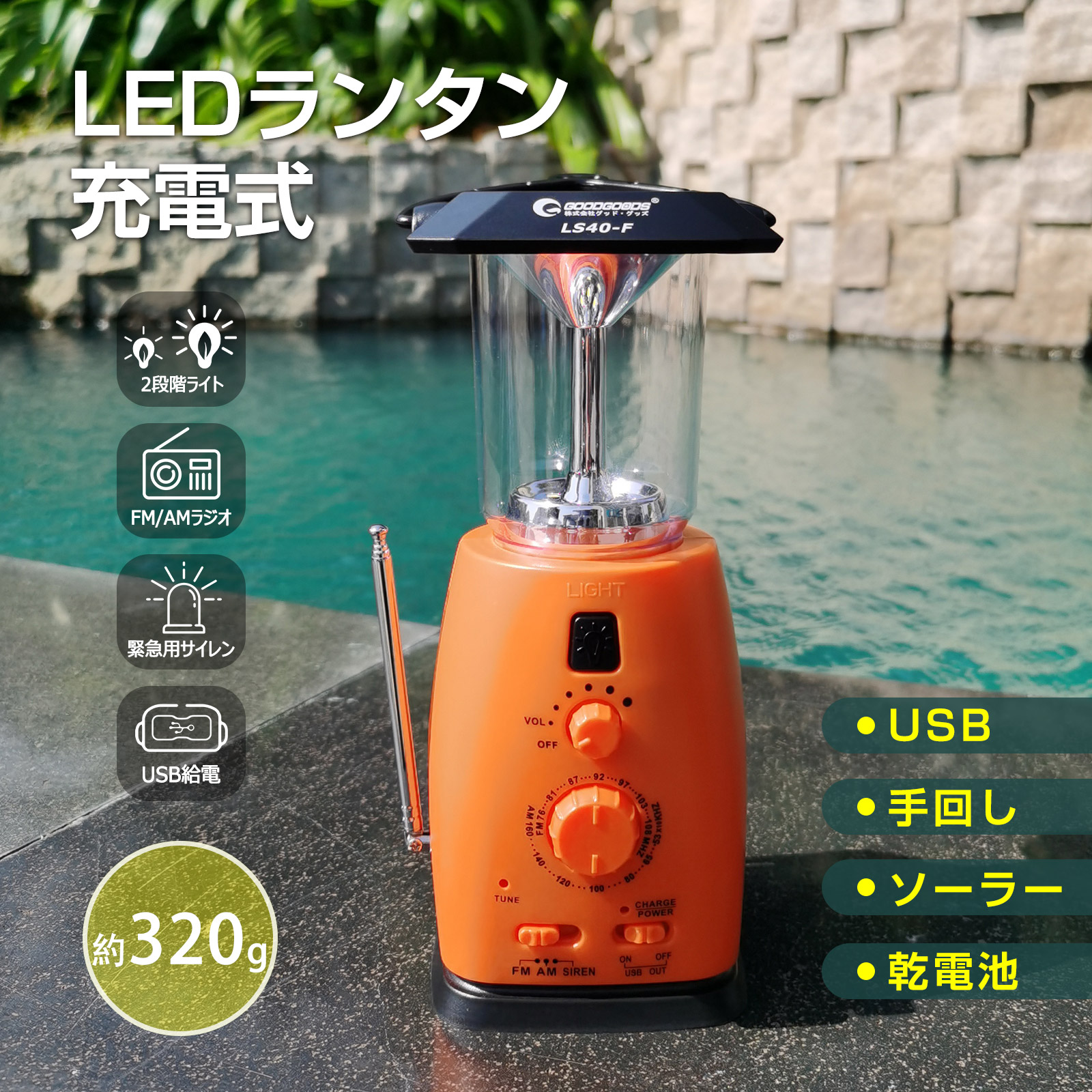 | 機能 | 照明・ラジオ・USB出力・90dBのサイレン | ||