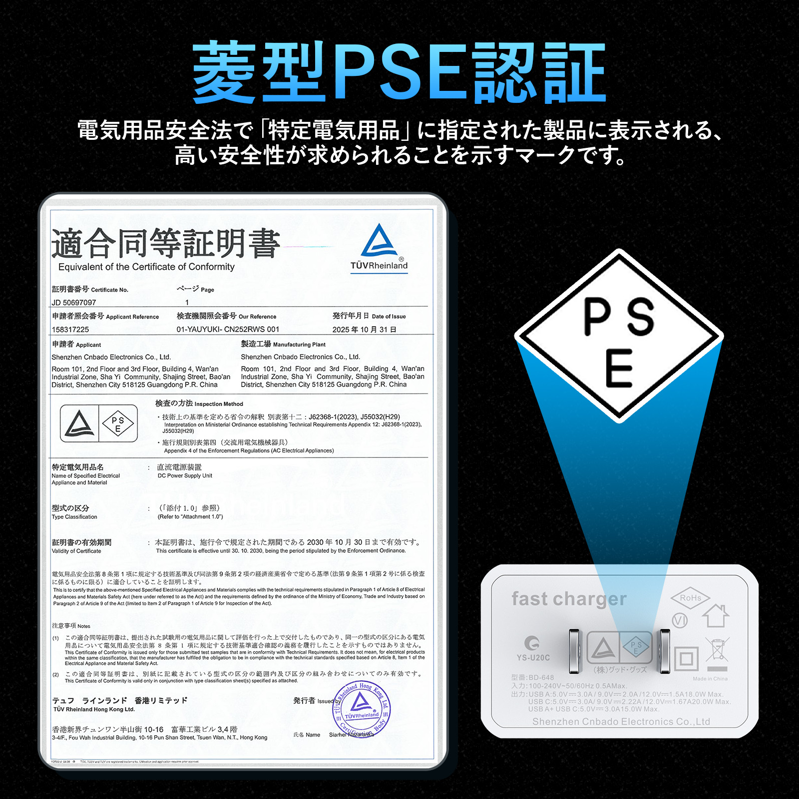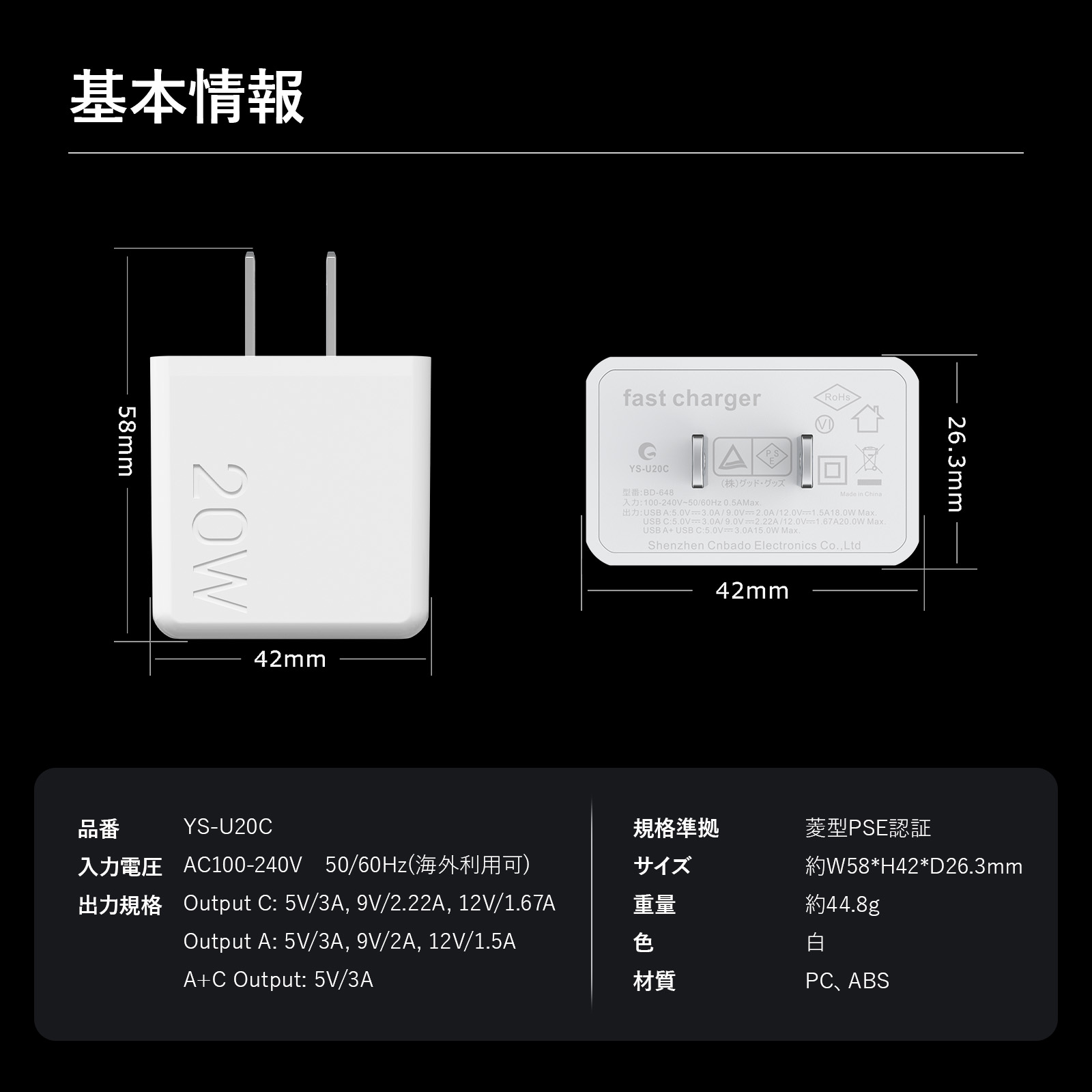 | 出力規格 | Output C: 5V/3A, 9V/2.22A, 12V/1.67A Output A:5V/3A,9V/2A,12V/1.5A A+C Output:5V/3A | ||
