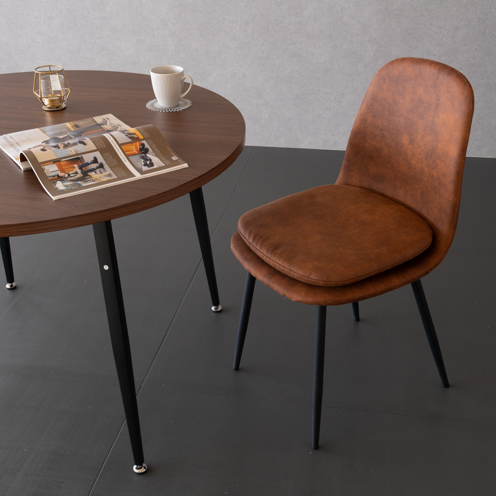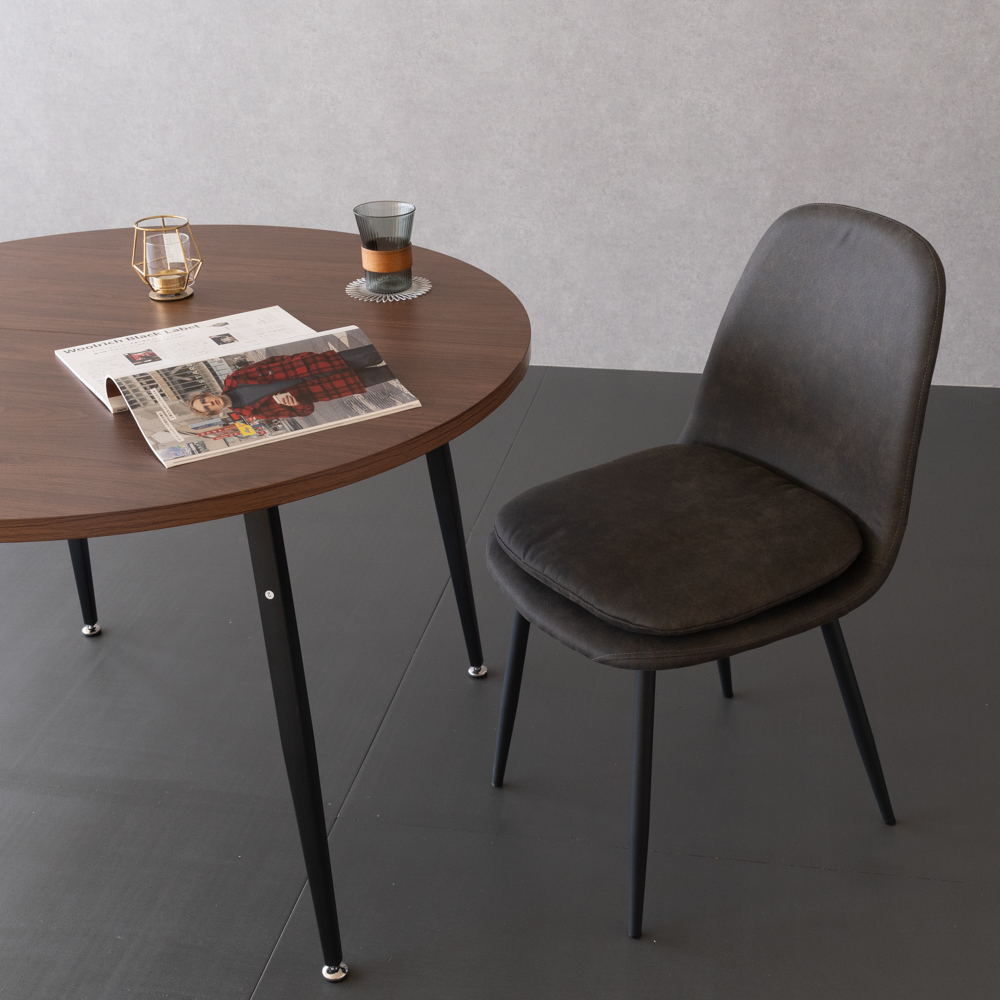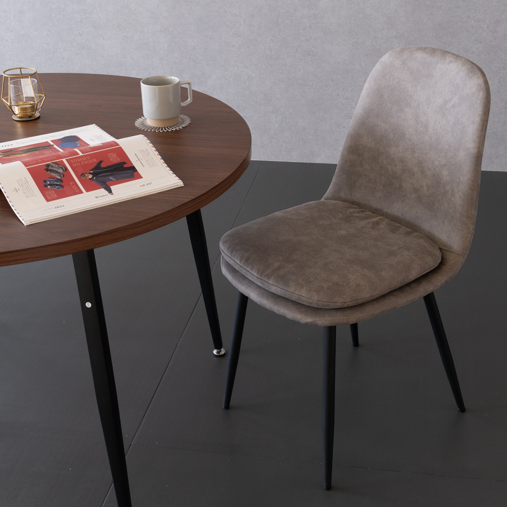 直径が円形105サイズの丸型ダイニングテーブルで高さは70cm。天板はメラミン素材で傷に強くブラウン、ナチュラル、グレーの3色展開。脚は黒のスチールを採用。4か所にガタツキ防止のアジャスターが付いています。