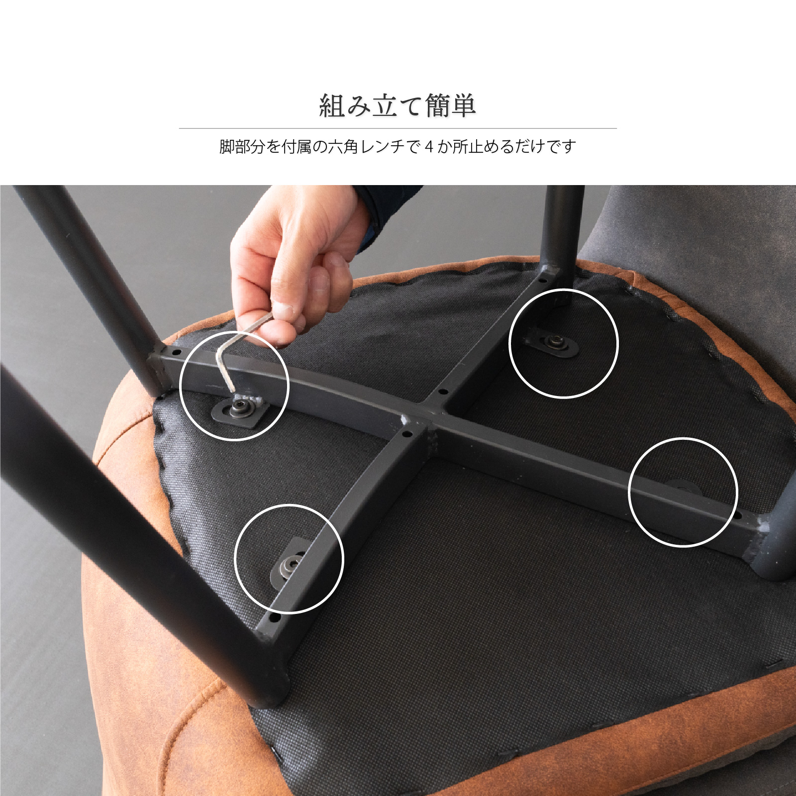 ・組み立ては脚を座面に取り付けるだけの簡単設計。工具不要で簡単に取り付けが可能です