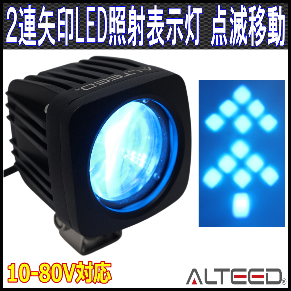 | □2連矢印デザインをLED照射投影します。 □約0.8秒間隔で点滅流動するので周囲への注意喚起ライトとしてご活用いただけます。 □ボディは錆腐食に強いアルミダイカスト製。IP67高防水防塵規格品です。 □10-80V対応なので、乗用車から高電圧仕様の作業車まで幅広く対応します。 □フォークリフトや庫内作業車の周囲への注意喚起表示灯、夜間道路作業時や停車時の誘導表示灯等に最適です。 |