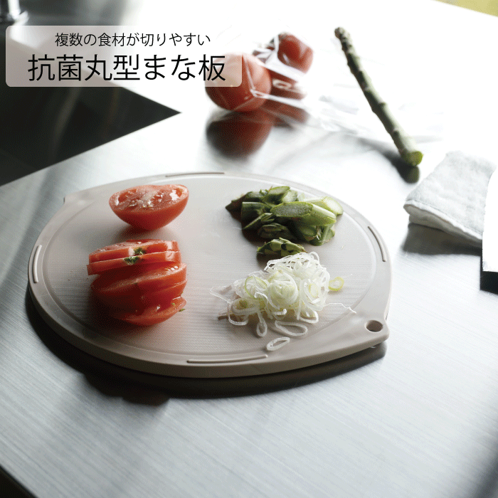 【●日本製】抗菌 丸型 まな板 食洗機対応 熱湯消毒対応 フック穴付き 抗菌加工 両面滑り止め仕様 グレー ベージュ 複数の食材が切りやすい抗菌丸型ま