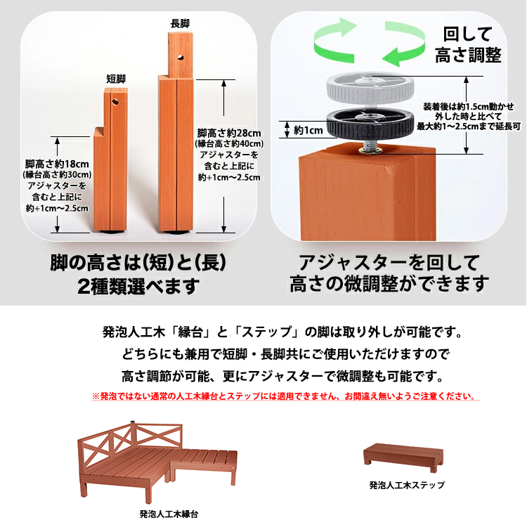 発泡人工木製のウッドデッキの縁台とステップ兼用で使える高さ調節用の脚です。短脚と長脚が選べてアジャスター付きで更に微調整が可能です。当店の発泡人工木縁台とステップ専用で、通常の人工木にはご使用いただけません。設置や組み立て簡単で塗料を塗る必要もなく、お庭やベランダ、バルコニーなど様々な場所をおしゃれに彩ります。通常の人工木縁台は中が空洞になっていますが、発泡人工木縁台は中が詰まっており空洞ではなく頑丈です。
