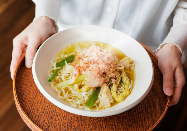 スパイスとかつおの旨味を活かしたカレースープです。玉ねぎや豚の旨味をベースに、スパイス香るカレースープは、かつお節の旨味を加えることで、親しみやすい風味に仕上げています。適度なとろみがあるため、スープに麺が絡みやすく、別添えのかつお節で、和のおいしさも味わえます。