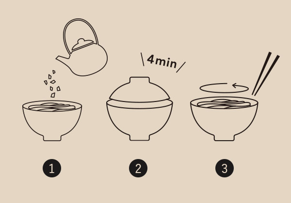 1.麺とスープを器に移し、沸騰させたお湯(または再沸騰させたポットのお湯)を麺が完全に浸るまで注いでください。(約400ml程度)