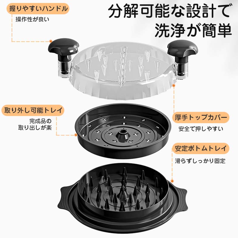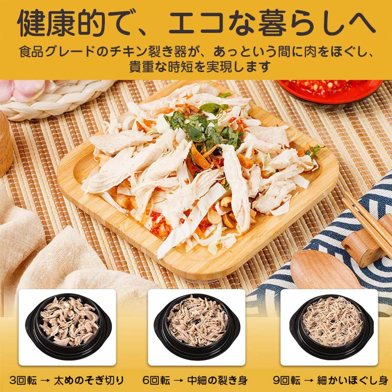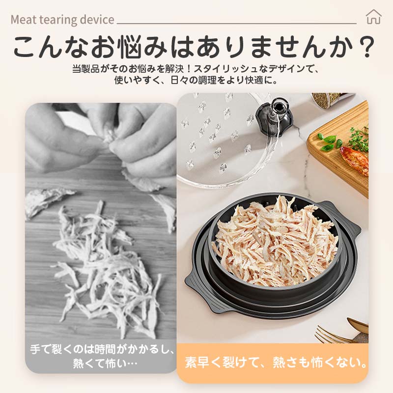 ミートシュレッダーのハンドルは、人間工学に基づいてバランスが取れた設計を採用しており、使用中の快適でスムーズな操作を実現します。滑り止めゴムベースにより、頻繁に使用する際のより安定した操作が可能です。