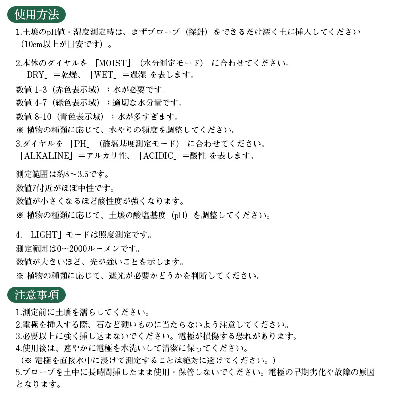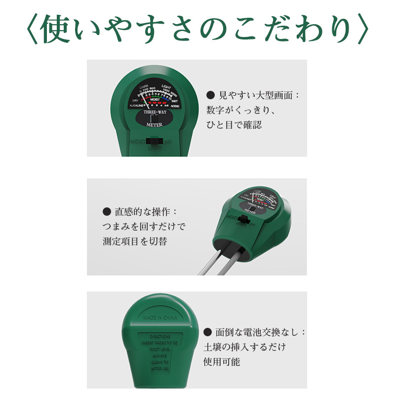 電池不要 土壌の挿入するだけ!簡単に利用可能な土壌PH測定器です。