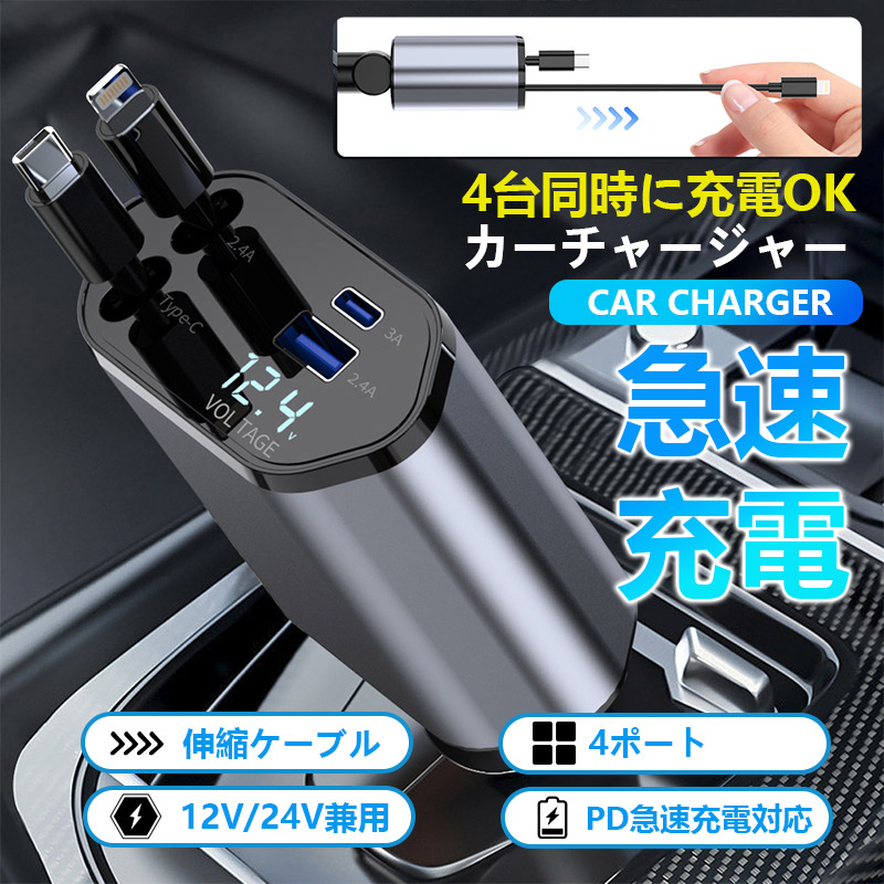 シガーソケット カーチャージャー 充電器 車 急速充電 タイプC 4ポート type-Cポート 車載 リール式 巻き取り 伸縮ケーブル USB充電