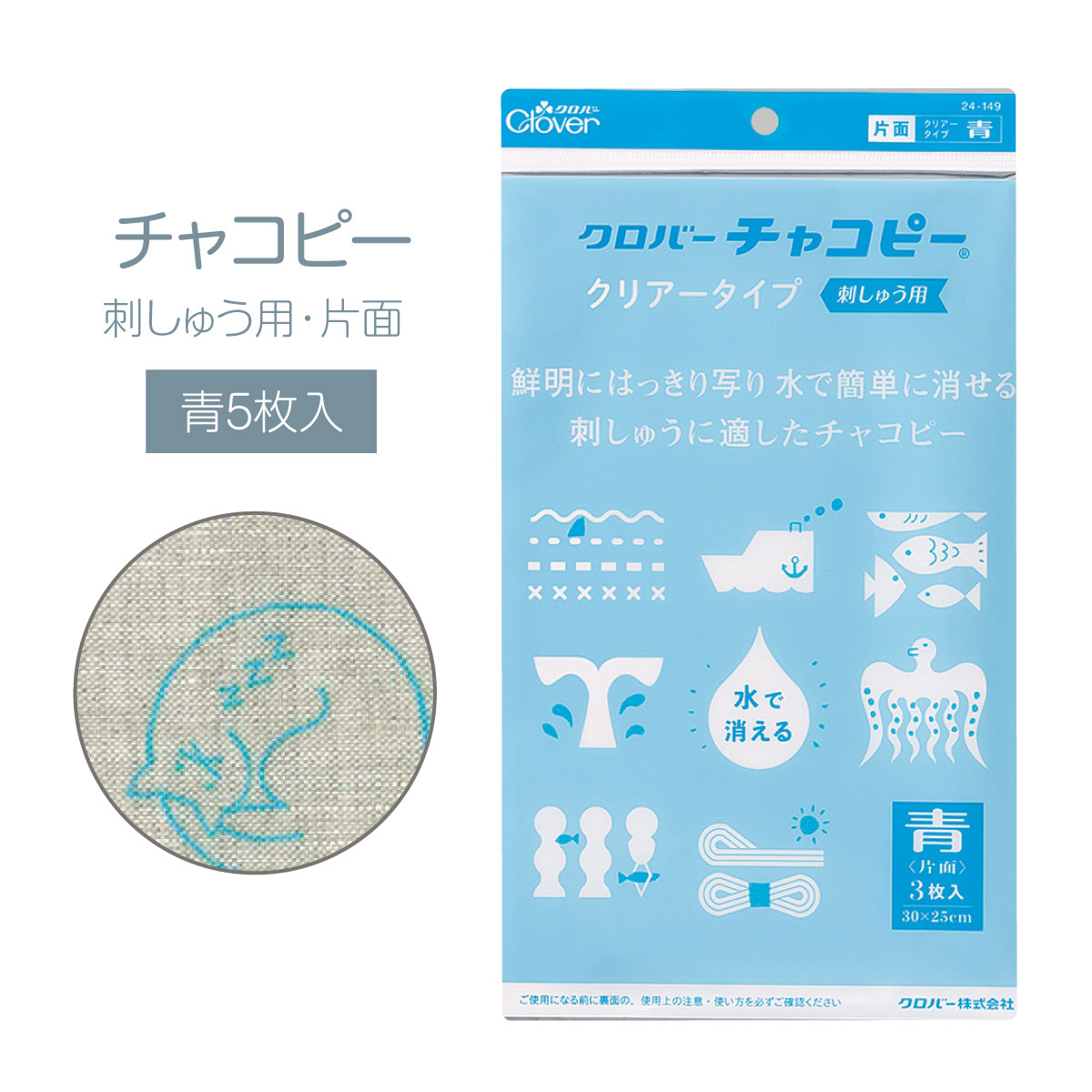 ※色の濃い生地では、クリアータイプは印が見にくいので、「クロバーチャコピー刺しゅう用<片面・白>」をお使いください。