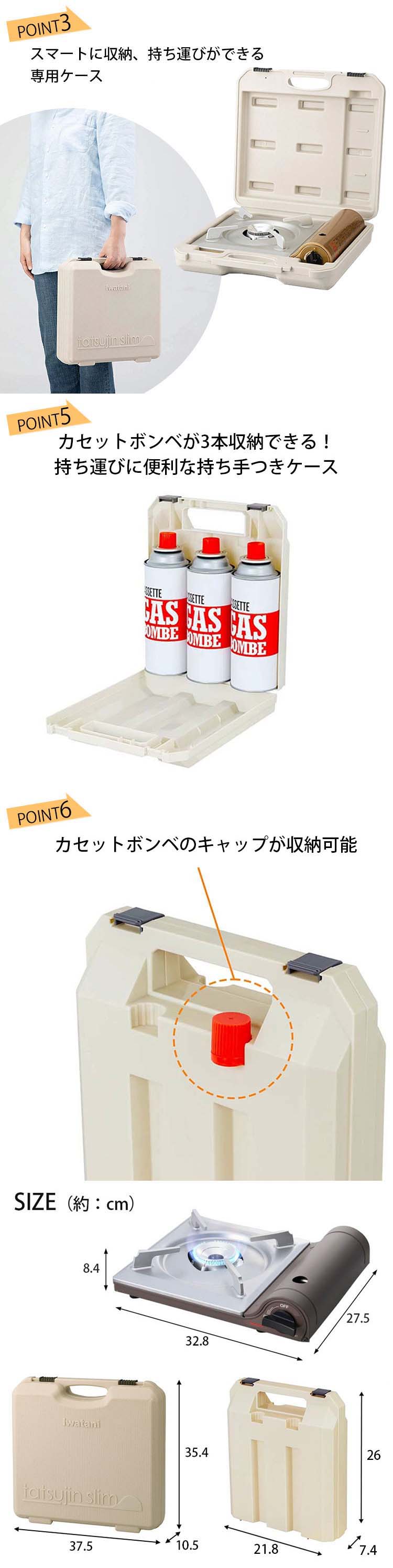 ・さらに、カセットボンベを3本収納できる専用ケースも付属。保管時の汚れやホコリ対策にも役立ちます。