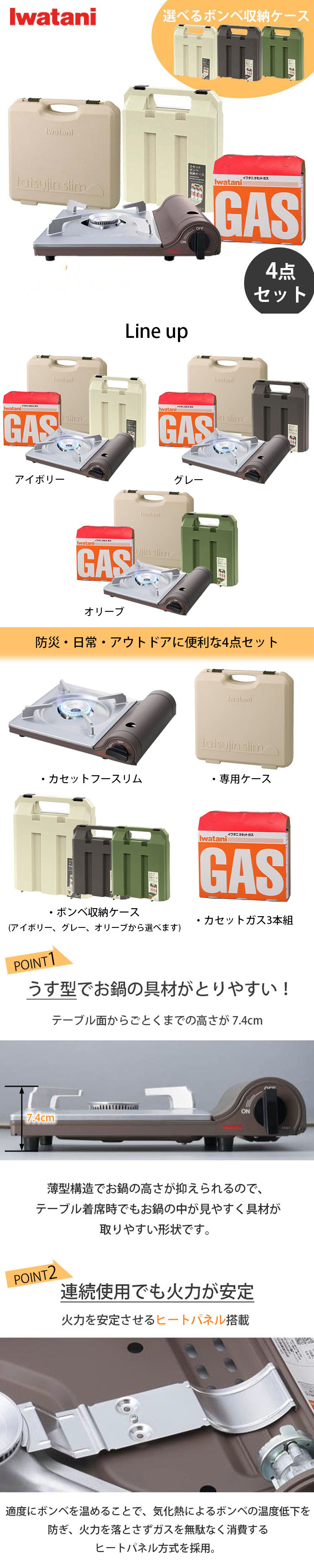 ・薄型設計にこだわったカセットコンロ本体、専用収納ケース、カセットガス3本組、カセットボンベ収納ケースがセットになった便利な4点セットです。
