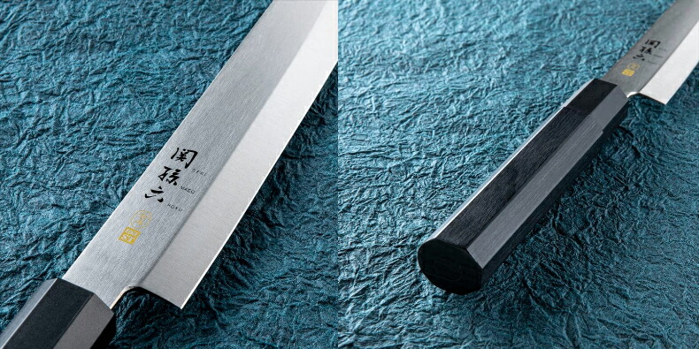![]() 金寿ST 柄の高級感と、こだわりの手当たり フィット感の高い「積層強化木八角ハンドル」 柄の素材には高級感があり、強度に優れた積層強化木を使用。 天然木に特殊加工を施し、木の良さを活かしつつ、水に強く仕上げました。 衛生的で耐久性の高い「ハンドルの固定方法」 刃体は樹脂との同時形成により刃と口金部分の境目に隙間がなく衛生的。 独自の接合方法でより高い耐久性を実現しました。 手当たりの改善 刃元部分の角を落とすことで手当たりも良く仕上げております。 KAI独自の刃付け方法 研ぎやすい、またお手入れしやすい刃先にすると同時に、抜群の切れ味をご提供致します。 AI独自の特殊技術「糸切刃」 切れ味の良い刃に仕上げるためにステンレス製和包丁では難しい糸切刃付けを独自の技術により実現させることに成功。 また、小刃を細かい糸切刃にすることで研石で研ぐ量を減らし、お手入れしやすい刃先です。 ![]() 素材の組織細胞をつぶさないで一気に引き切る和包丁の代表。 家庭用の刃渡りは210mm〜240mmが一般的ですが、プロ用は240mm〜360mmとかなり長いです。 片刃包丁ならではの切り口の美しさがあります。 ![]() |