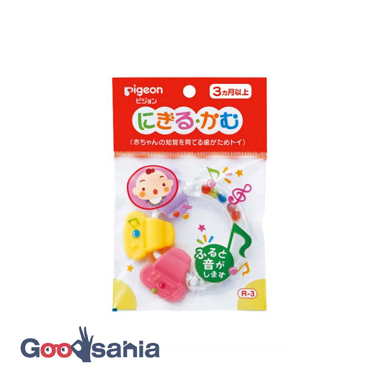 赤ちゃんがにぎりやすい持ち手のついた歯がためトイです。赤ちゃんの手にぴったりサイズの、にぎりやすい持ち手。振ると音がします。おくちに入れる部分にはさまざまな凹凸がついていて、バラエティーにとんだ噛みごこち。やわらかい素材で安心です。