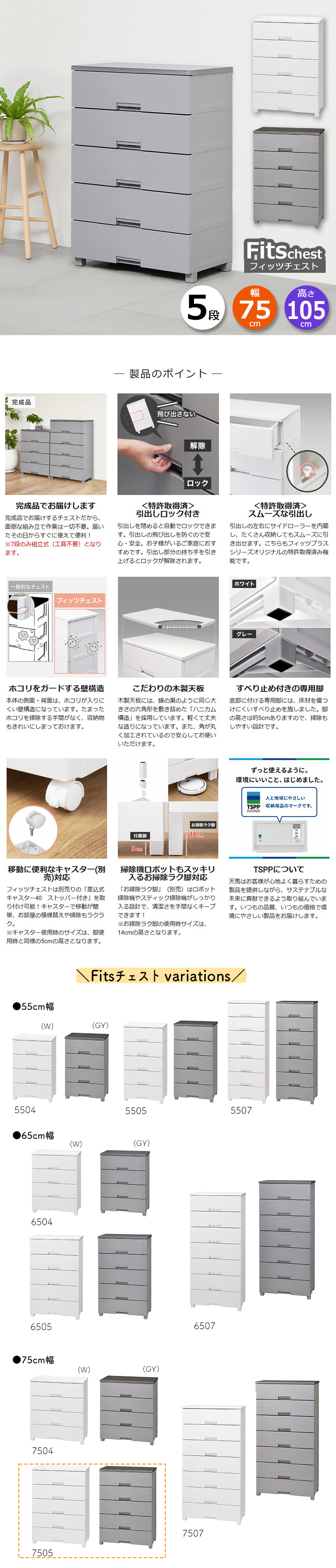 フィッツプラス fitsプラス Fits収納 FITS fits フィッツ 75cm 75 タンス リビング収納 衣類収納 収納家具 収納用品 完成品 プラスチック 引き出し 引出し ひきだし ケース 衣装ケース 脚付 脚 脚付き 足 足付き 天板 fits 洋服 衣類 服 おしゃれ オシャレ お洒落 シンプル フラット インテリア デザイン モノトーン クローゼット リビング 脱衣所 子供部屋 新居 新生活 一人暮らし 引っ越し ロック付き ロック機能 ロック 掃除 楽 掃除しやすい 便利 使いやすい すべり止め すべりにくい ホワイト グレー tenma TENMA 4904746160560 4904746160577