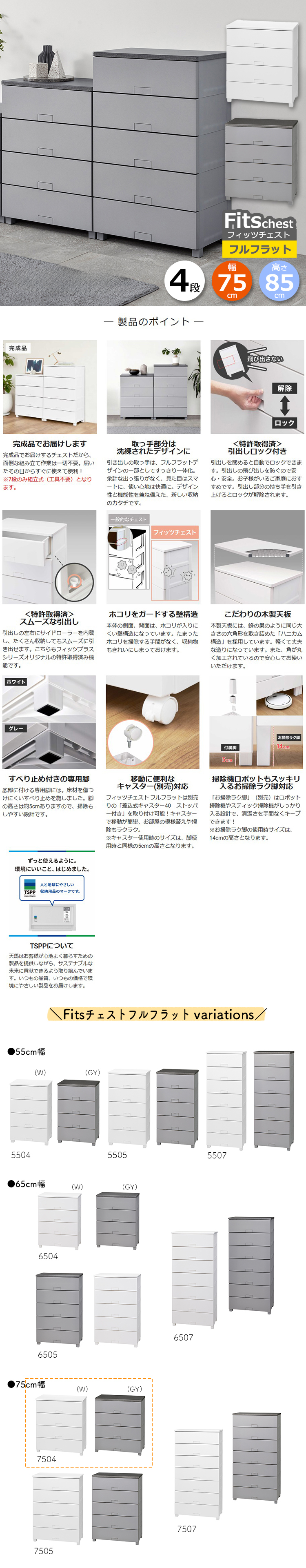 フィッツプラス fitsプラス Fits収納 FITS fits フィッツ 75cm 75 タンス リビング収納 衣類収納 収納家具 収納用品 完成品 プラスチック 引き出し 引出し ひきだし ケース 衣装ケース 脚付 脚 脚付き 足 足付き 天板 fits 洋服 衣類 服 おしゃれ オシャレ お洒落 シンプル フラット インテリア デザイン モノトーン ホテルライク ノイズレス クローゼット リビング 脱衣所 子供部屋 新居 新生活 一人暮らし 引っ越し ロック付き ロック機能 ロック 掃除 楽 掃除しやすい 便利 使いやすい すべり止め すべりにくい ホワイト グレー tenma TENMA 4904746160669 4904746160676