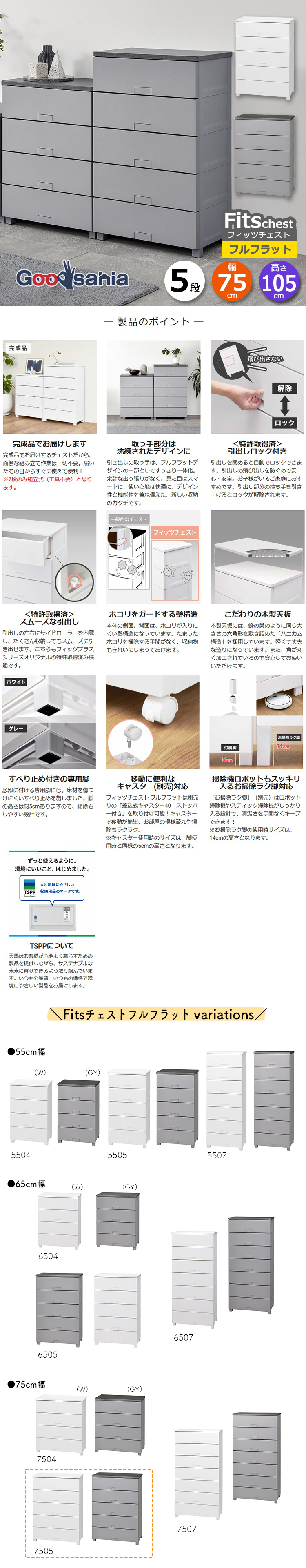 フィッツプラス fitsプラス Fits収納 FITS fits フィッツ 75cm 75 タンス リビング収納 衣類収納 収納家具 収納用品 完成品 プラスチック 引き出し 引出し ひきだし ケース 衣装ケース 脚付 脚 脚付き 足 足付き 天板 fits 洋服 衣類 服 おしゃれ オシャレ お洒落 シンプル フラット インテリア デザイン モノトーン ホテルライク ノイズレス クローゼット リビング 脱衣所 子供部屋 新居 新生活 一人暮らし 引っ越し ロック付き ロック機能 ロック 掃除 楽 掃除しやすい 便利 使いやすい すべり止め すべりにくい ホワイト グレー tenma TENMA 4904746160683 4904746160690
