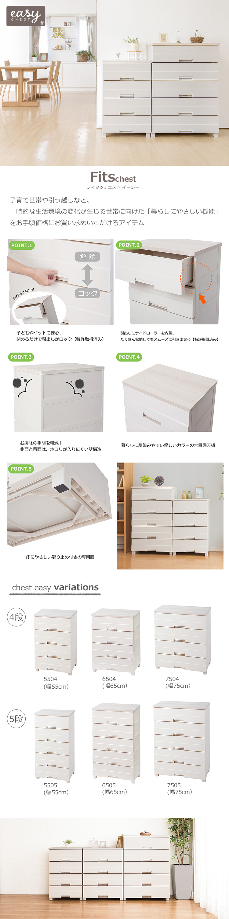 チェスト 引出し 引き出し タンス 収納 衣装ケース 衣類収納 リビング収納 プラスチック 4904746161604 TENMA chest easy 箪笥 ひきだし 完成品 65 65cm 引出しロック 安心 安全 収納家具 シンプル フラット ホコリガード クローゼット 子供部屋 衣類 洋服 掃除しやすい 新生活 一人暮らし 引越し 引っ越し 脚付き 脚付 ロック付き ロック機構 フィッツプラス イージー FE6504