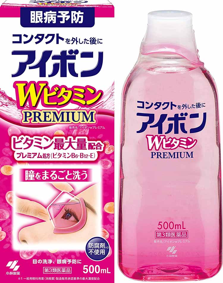 アイボンWビタミンPREMIUMは、3種類のビタミンとアミノ酸類を配合したピンクの薬液で、目にたまった汚れやほこりを洗い流し、瞳を健康に保ちます。