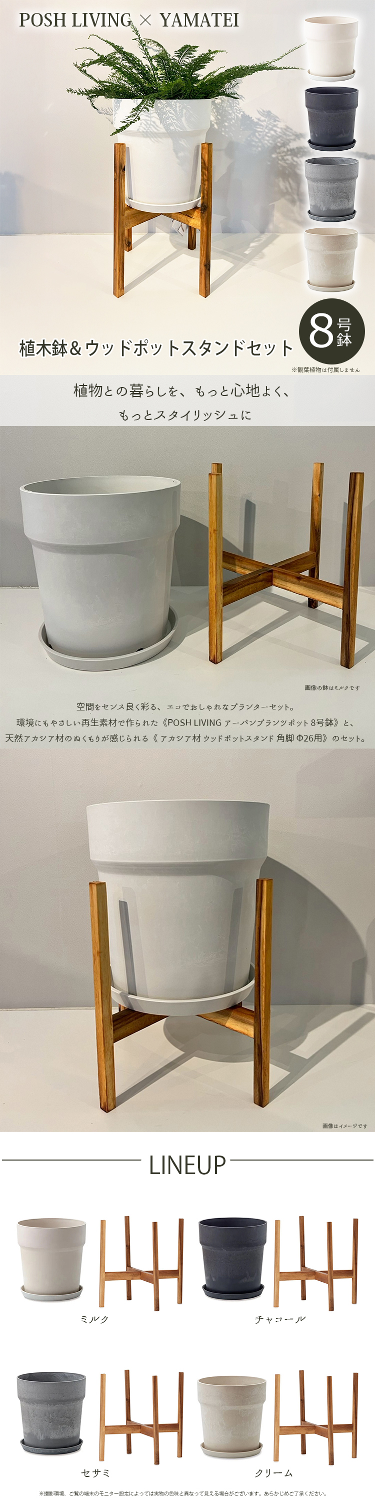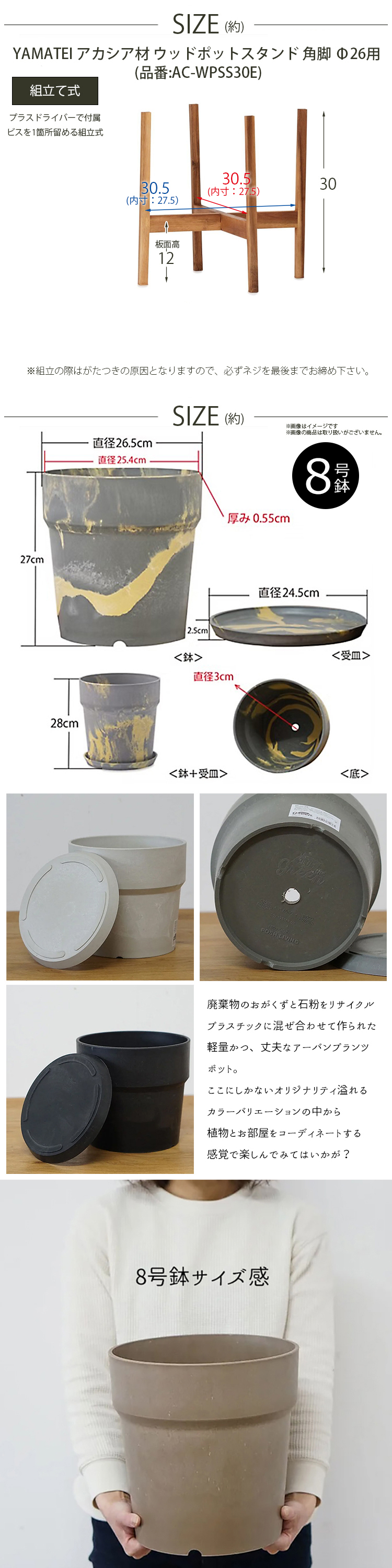 素材・材質:【植木鉢】プラスチック、ウッドパウダー、ストーンパウダー【スタンド】木材(アカシア材)