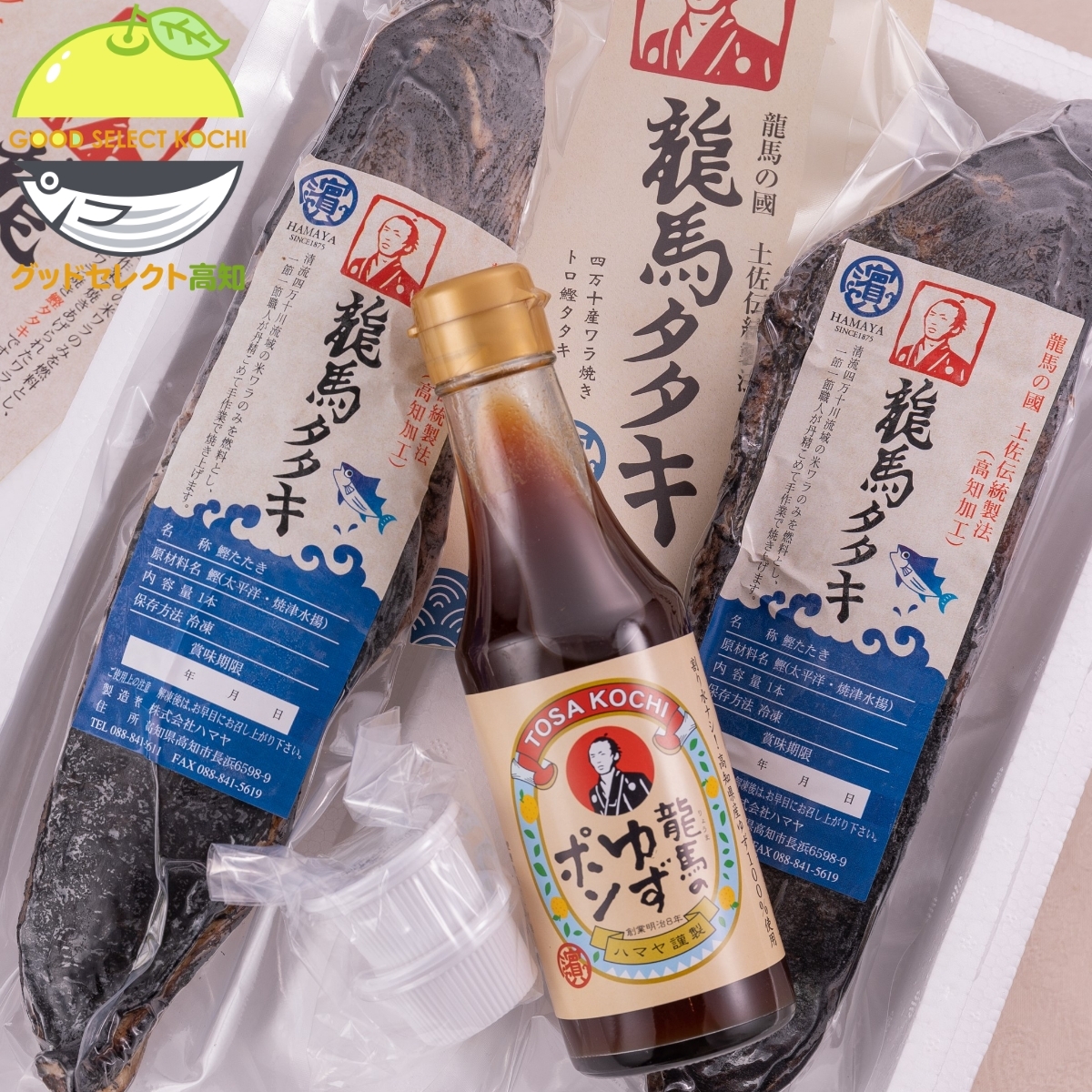 ●龍馬タタキ2節 700g、龍馬のゆずポン(ポン酢)200ml、天日塩6g×2個、商品パンフレット(解凍方法、食べ方他)二節で4〜6人前(厚切りの場合の目安です)