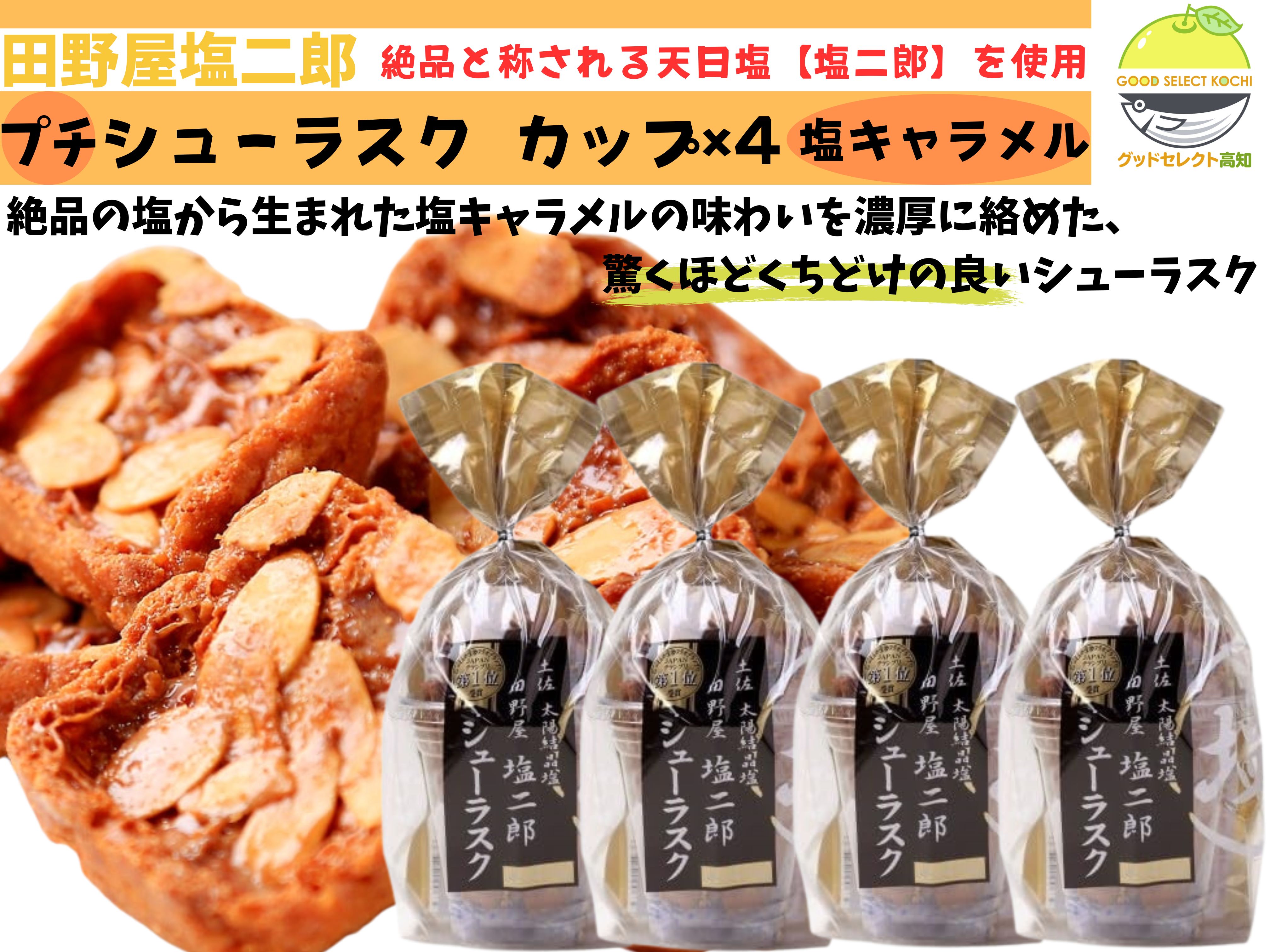 田野屋塩二郎 塩キャラメル シューラスク カップ 54g×4 ラスク 天日塩 高知 アーモンド ギフト 贈り物 プレゼント 手土産