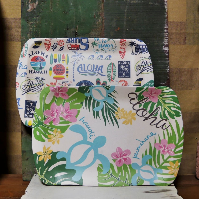 ハワイのモチーフがぎゅっと詰まったポップなデザインのバンブートレイです。軽くて使いやすいバンブーファイバー素材なので、お子様用やアウトドアにもおすすめです。サーフボードにビーチバスやモンステラ、プルメリアやホヌがやわらかい色味で描かれ、aloha、プメハナ(あたたかい、ぬくもり)、ハウオリ(幸福、幸せ)などの優しい気持ちになれるハワイ語が描かれています。