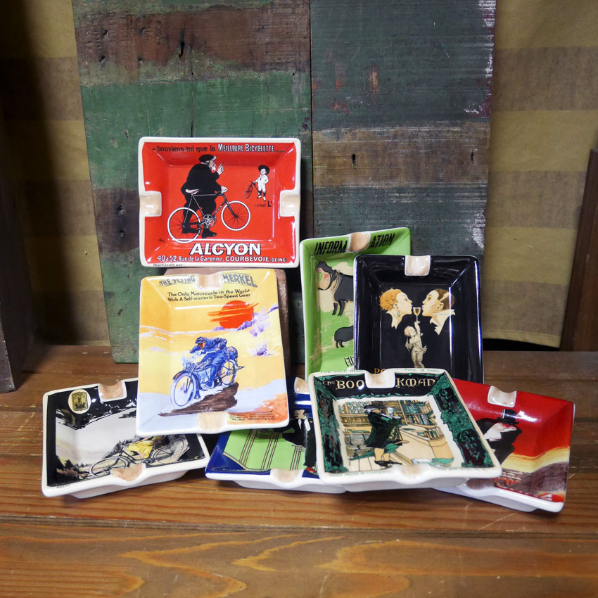 レトロでアーティスティックな柄がオシャレな卓上灰皿です。まさしく海の向こうの異国が得意とするアートが、はみ出さんとばかりに描かれた灰皿。レトロなポスターをそのまま小さくした様な主張の強い存在感は、数個並べてケンカさせたい程。タバコを吸わないのなら、コイントレイやアクセサリートレイとしてもおすすめ。古き良き時代感が漂います。