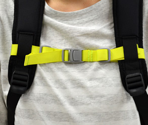 リュックサックのベルトに取り付けて、胸の前で固定し、ショルダーベルトのずれ落ちを防ぎます。
