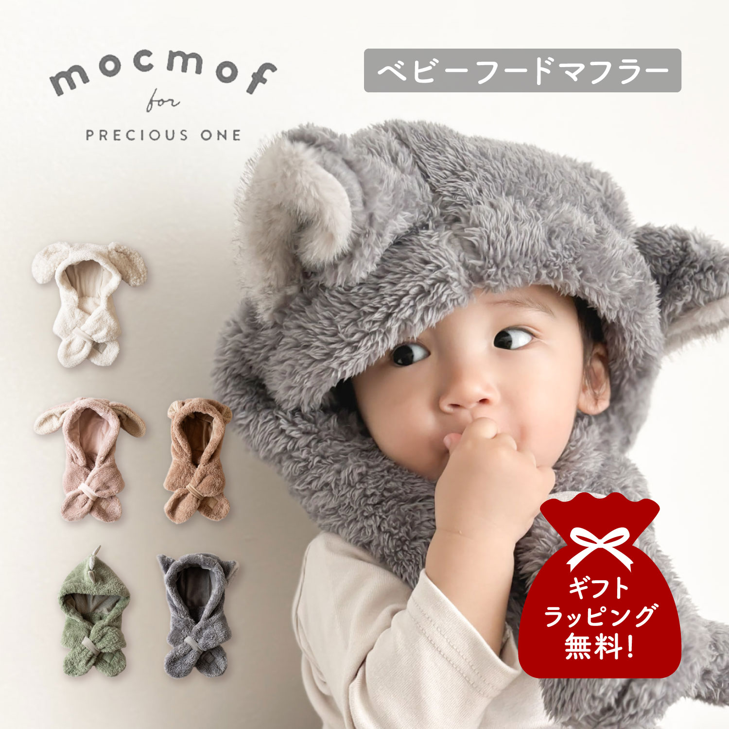 mocmof モクモフ フードマフラー 帽子 ベビー キッズ 70-120cm対応 赤ちゃん ぬいぐるみフードマフラー グレー ライト ブラウン グリーン ピンク 622-574233