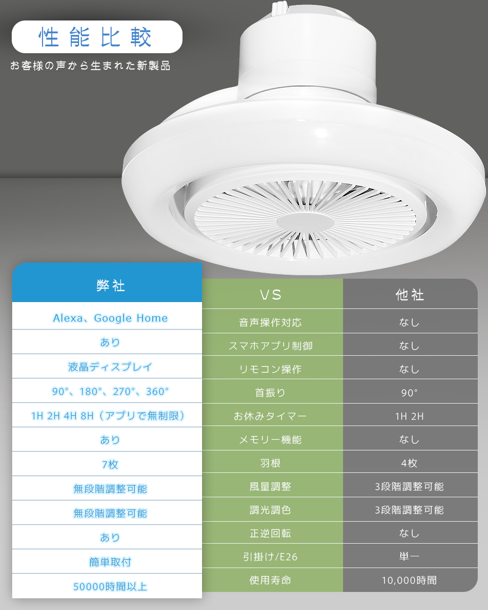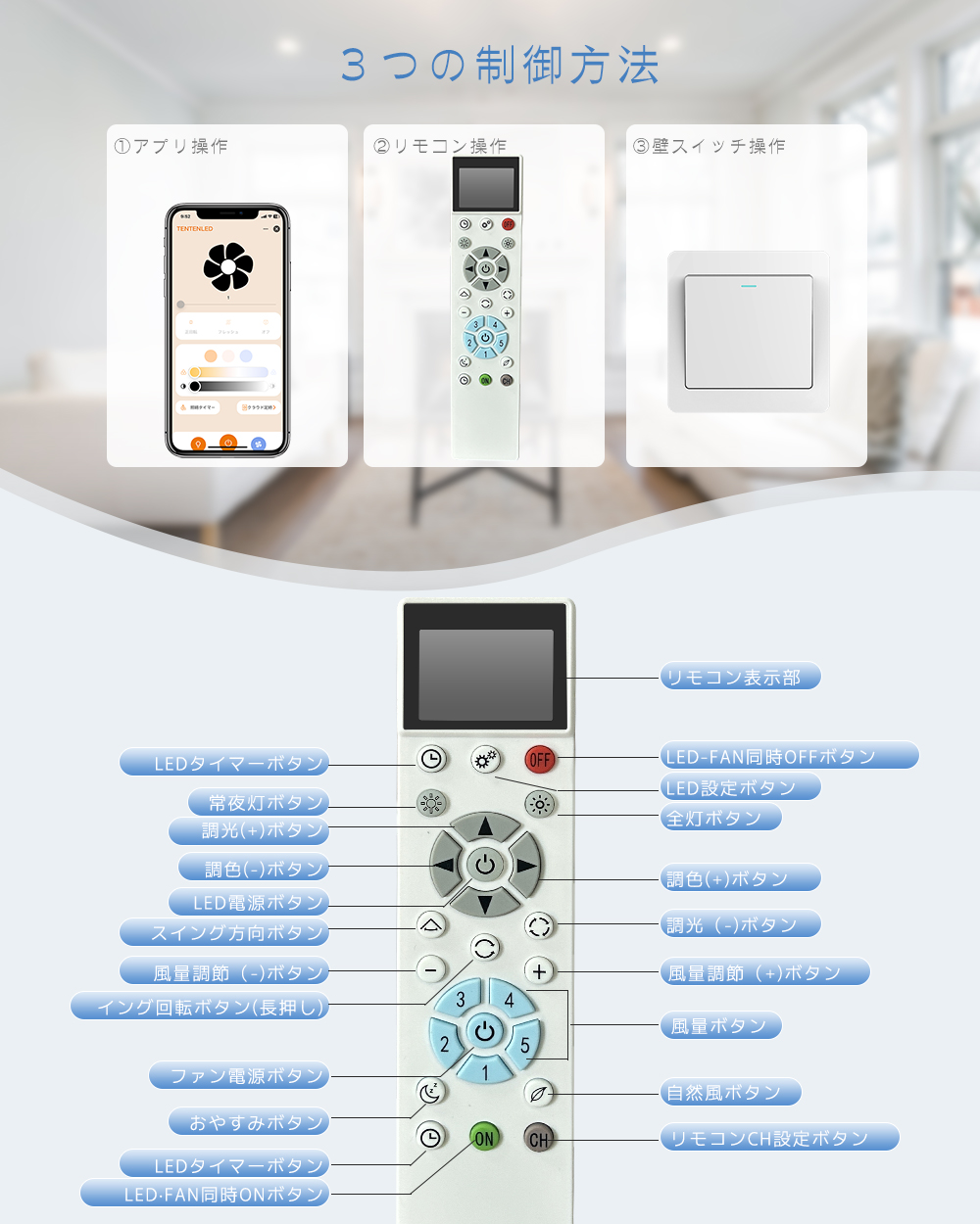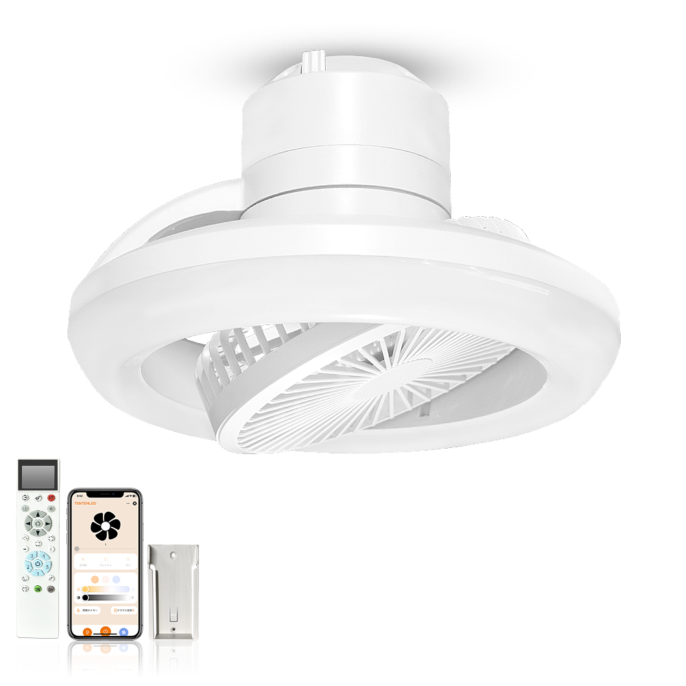 | 音声操作&アプリ対応! | 通常モデルと同様にリモコンがついているほか、スマートフォンアプリ「Wi Home」・Alexa・Google Homeで操作できます。AlexaやGoogle Homeの音声コマンドだけで操作できるので、手を使わずとも「ファンをオンにして」と声に出すだけで、オンにしたりできます。もちろんリモコン操作にも対応しているので、通話等でスマートフォンが使用中の時でも安心です。 |