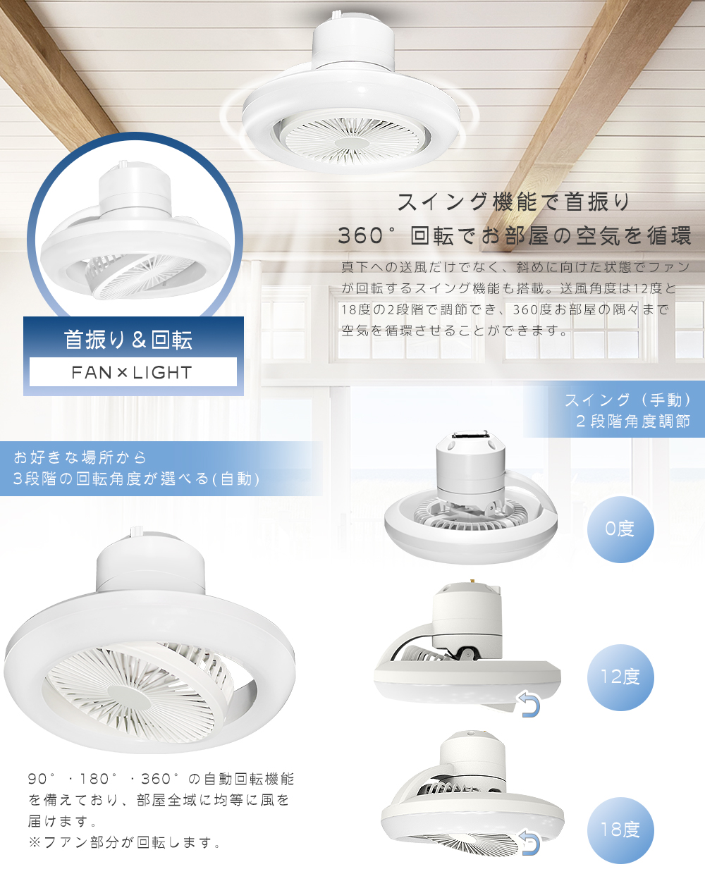 | 90度、180度、360度の自動首振り | 90°・180°・360°の首振り機能を備えており、部屋全域に均等に風を届けます。風向きを自由に調整でき、特に360°回転機能により広範囲に風を送り出します。どの場所にいても快適な空間を作り出せます。 |