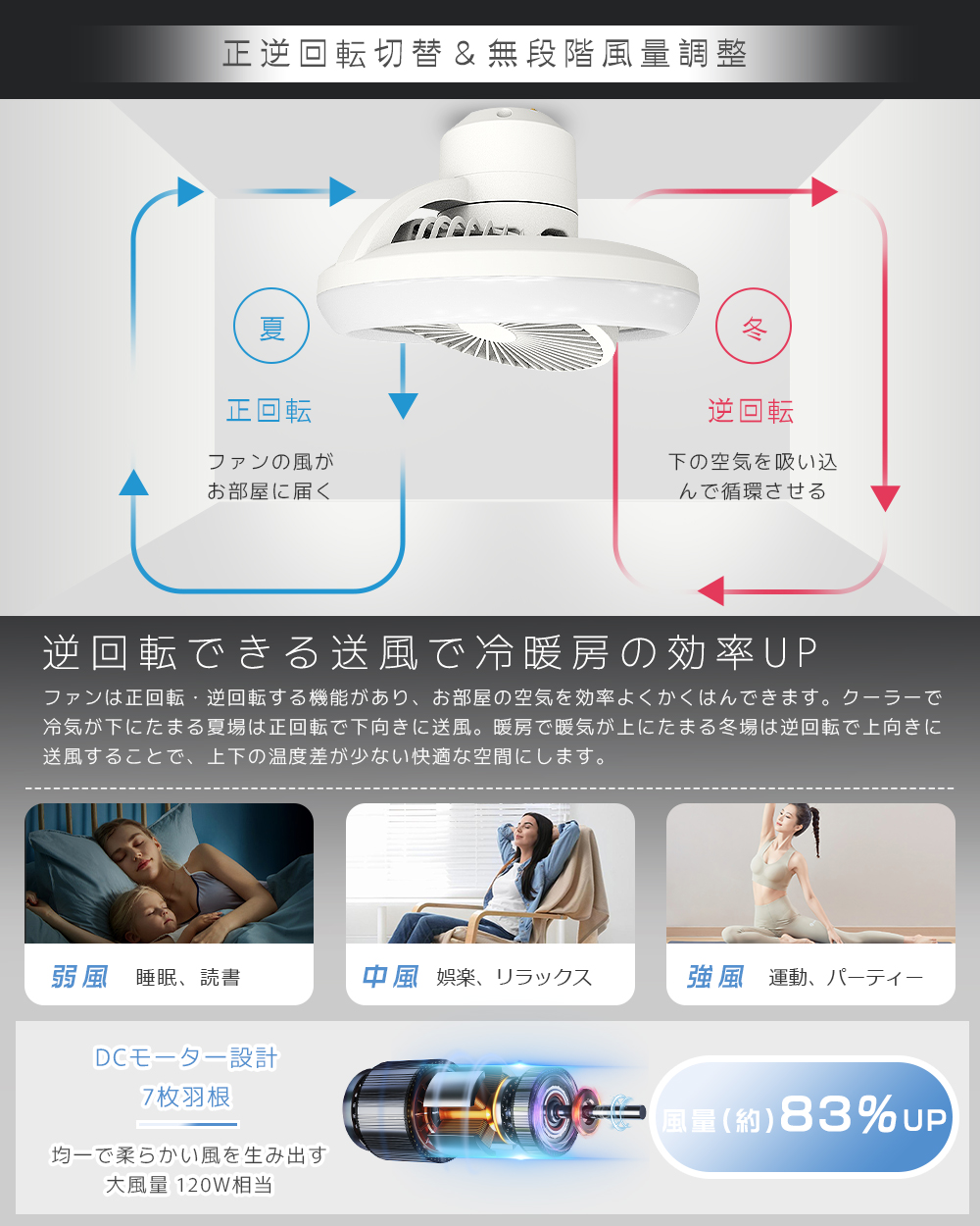 | 正逆回転機能 | シーリングファンライトは、先進の「正逆回転機能」を搭載したマルチシーズン対応モデルです。夏季には時計回りで直進性の強い涼風を発生させ、体感温度を最大3℃ダウンさせる体感冷却効果を発揮。冬季には反時計回り運転で天井に向かって気流を送り、暖房の熱気を部屋全体に均一に拡散させる「ヒートミックス機能」を採用しています。 |