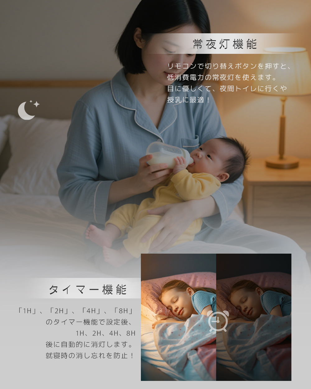 | タイマー、メモリ、常夜灯機能 | 就寝時や外出時に自動的に運転を操作してくれ安全安心!メモリー機能が搭載されたので、オフする直前の状態が再現されます。リモコンの「常夜灯」スイッチを押すと、低消費電力になります。真っ暗だと眠れない方にも安心の常夜灯付きます。一人寝て始めたばかり子供の部屋また夜間授乳に最適!個人や家族の好みや日常的なニーズに対応可能! |