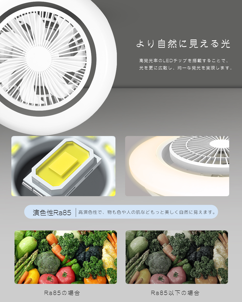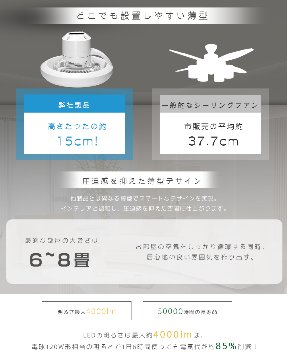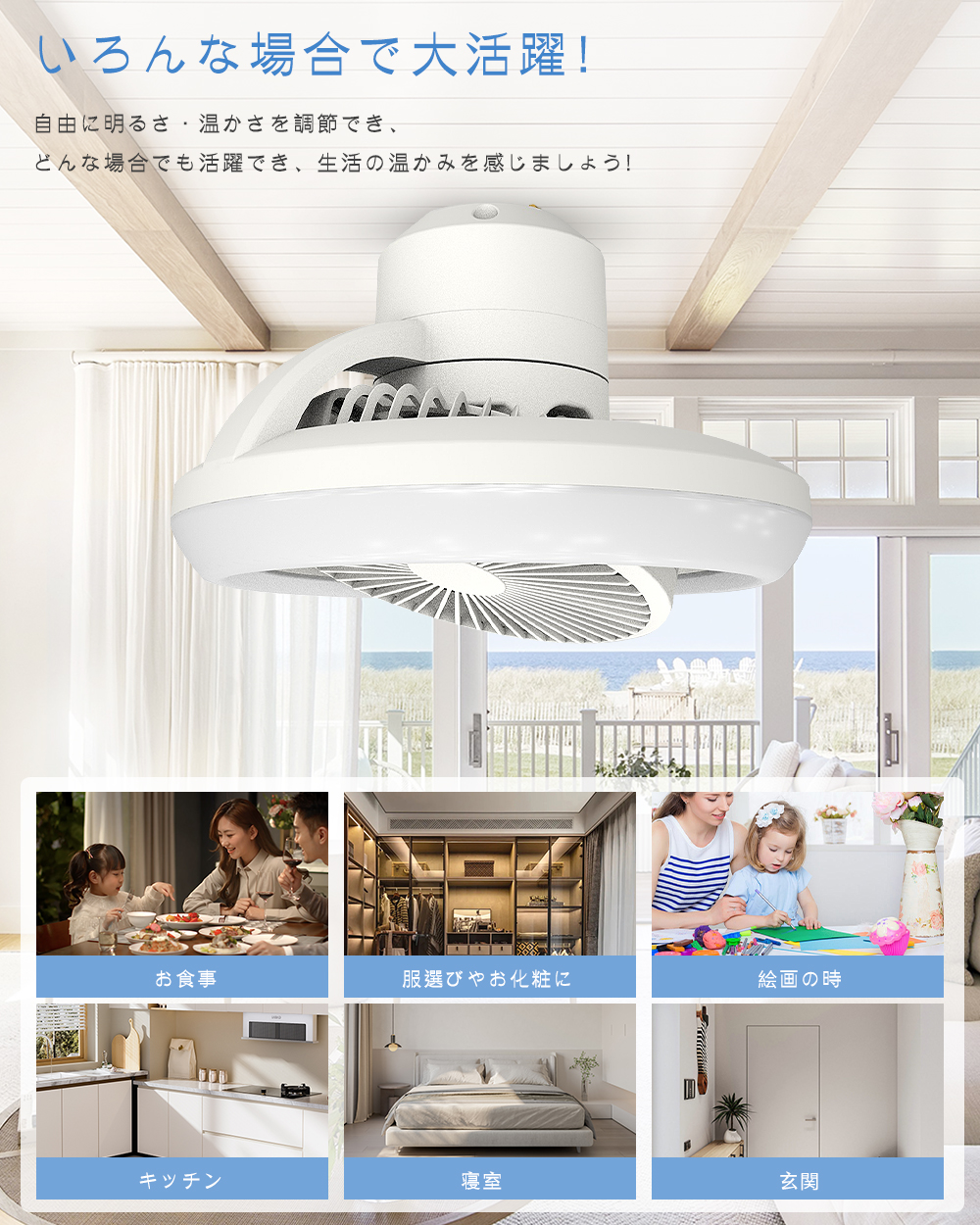 | 一台二役、光&風一体化 | LEDファンライトは「ファン」と「LEDライト」を組み合わせたシーリングファンライトです。天井に設置することで風と光をお届け!循環効率がアップし、足元に置かないので邪魔にならず小さなお子様やペットがいるご家庭に最適!お部屋の空気をしっかり循環し、温度差を解消する同時、居心地の良い雰囲気を作り出す快適に。 |