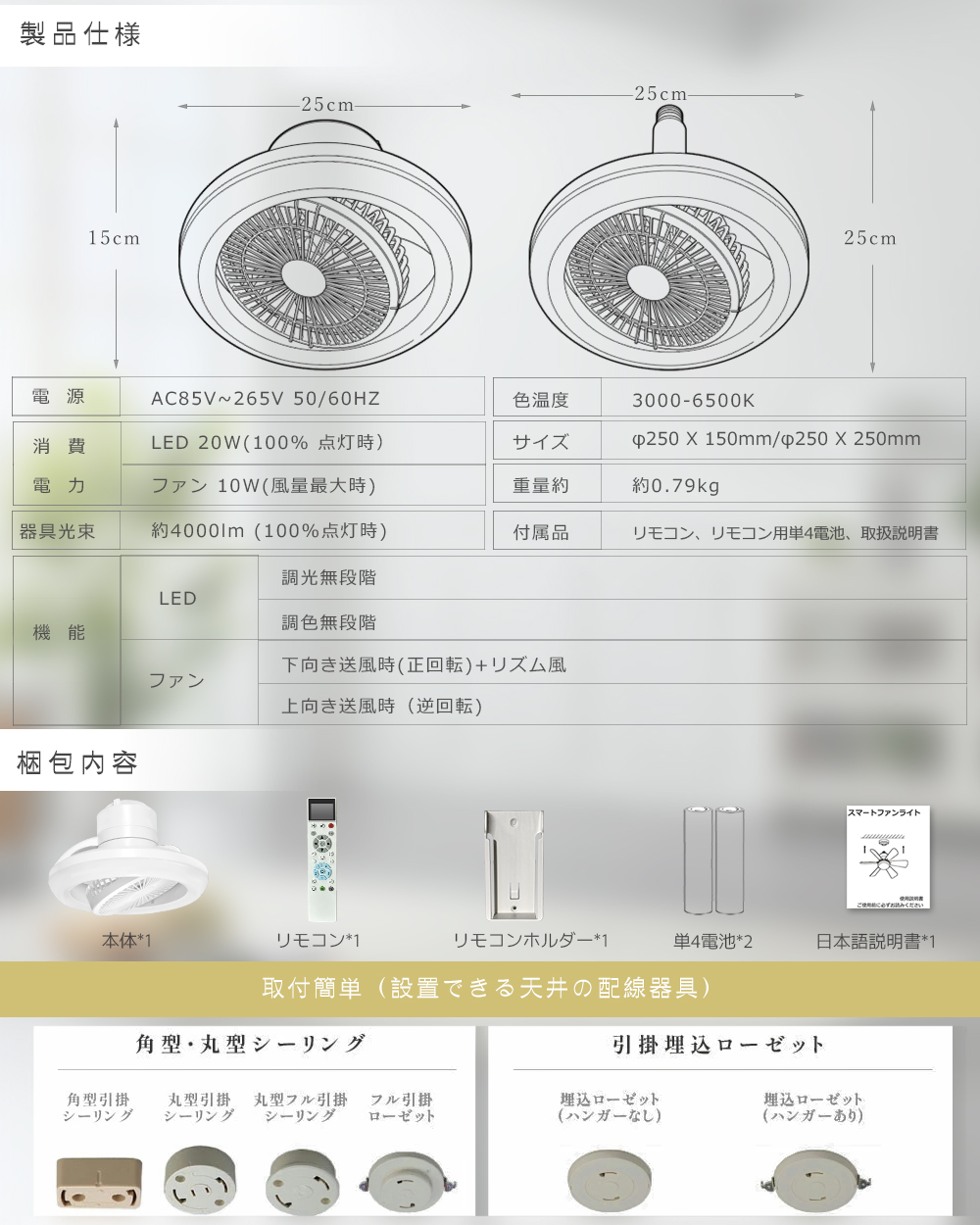 | ■サイズ(約) | 引掛け式(Φ250×H150mm)/E26口金式(Φ250×H250mm) |